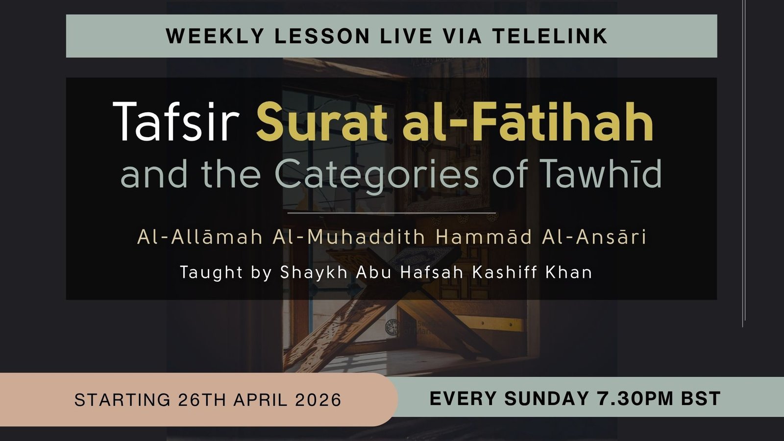 Below you can view our current weekly lesson schedule and upcoming talks / conferences. These lessons, talks and conferences are open to everyone and we invite you to attend. We host special events throughout the year to address topics and benefit the wider Muslim community.