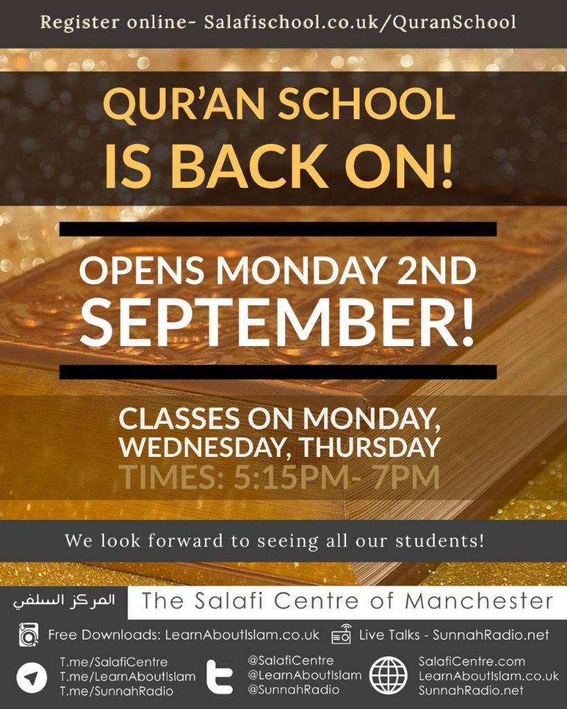 We are delighted to announce that the Qur’an School will be starting the new academic year from Monday 2nd September 2019. Classes will run on Monday, Wednesday and Thursday from 5:15 pm to 7pm. We look forward to seeing you then!