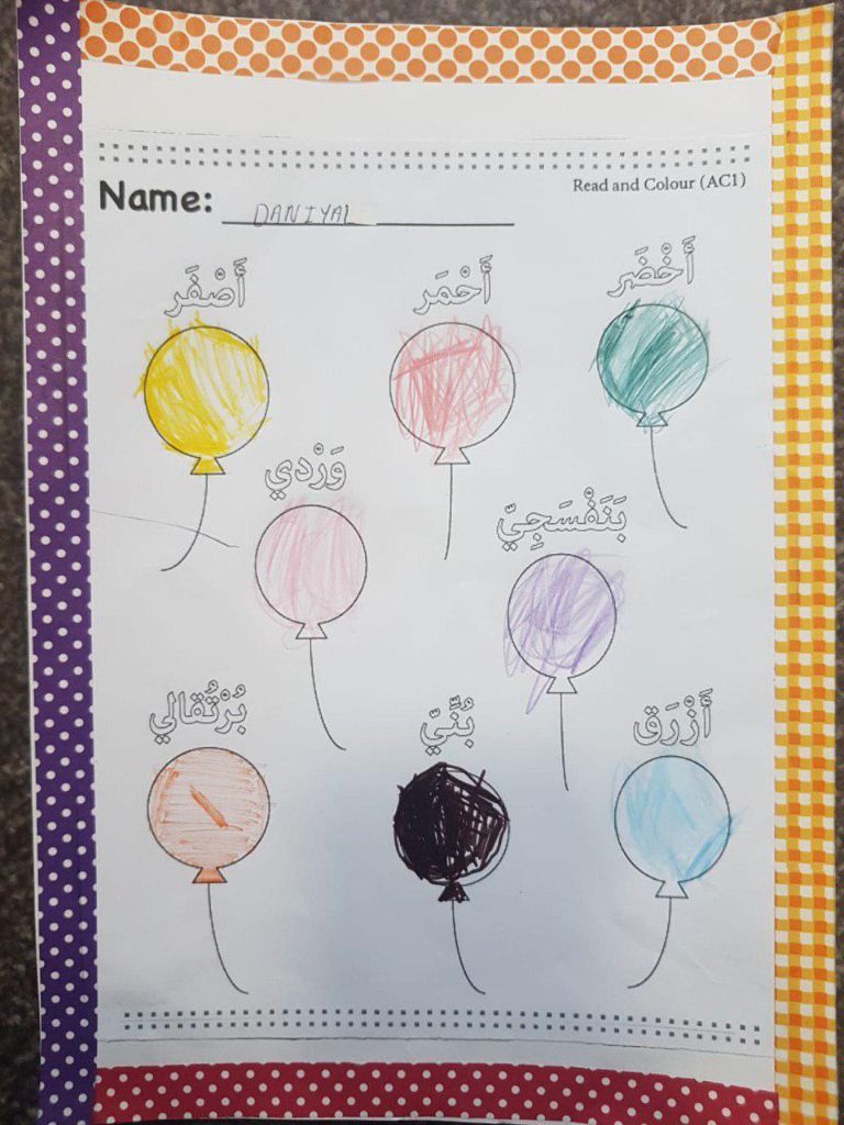 Class 5-6 have been learning the colours in Arabic as part of their Arabic lesson including: green, red, yellow, purple, pink, blue, brown and orange. They are able to formulate sentences in Arabic incorporating the colours such as; “My favourite colour is red.” “أُحِبٌّ اللَّوْنُ أَحْمَر” as part of their biography and can say what colour an object or animal is in Arabic such as “The monkey is brown.” “اَلْقِرْدُ بُنِّيّ” and “The chair is red.” “اَلْكُرْسِي أَحْمَر”.