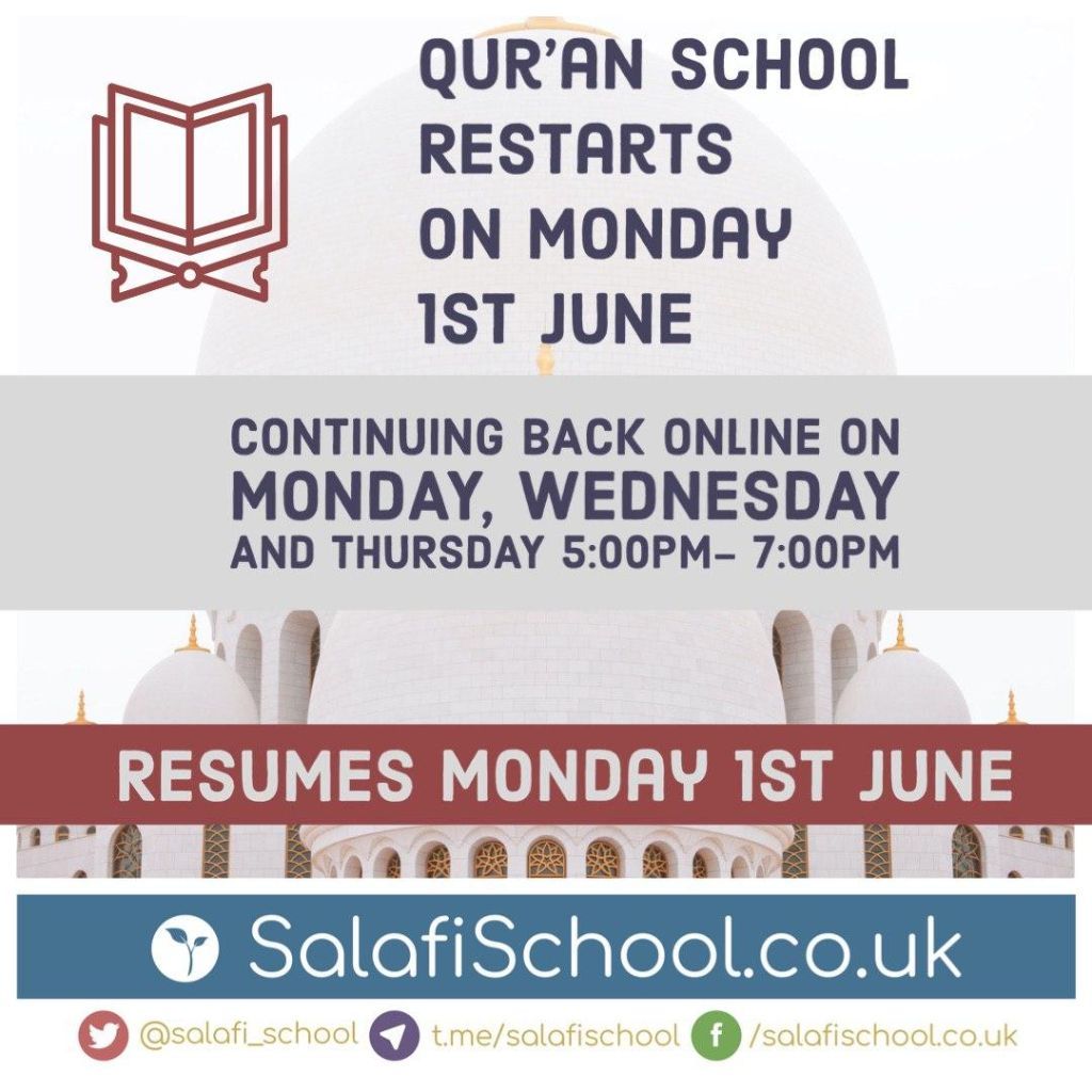 Qur’aan School will close end of tomorrow inshaaAllah. For parents wanting to continue we wil be offering Online Lessons at the same time between 5 and 7 pm. You can signup here: Salafischool.co.uk/Online