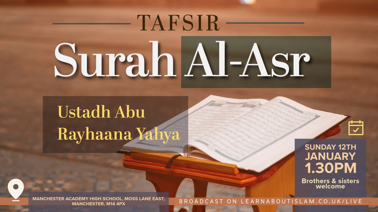 LIVE LESSON – in South Manchester this Sunday ! Tafsir Surah Al-Asr Ustādh Abu Rayhaana Yahya حفظه الله Sunday 12th January 2025 ⏰ 1:30pm Men, Women & Families – All Welcome Venue Address: Manchester Academy High School, Moss Lane East…