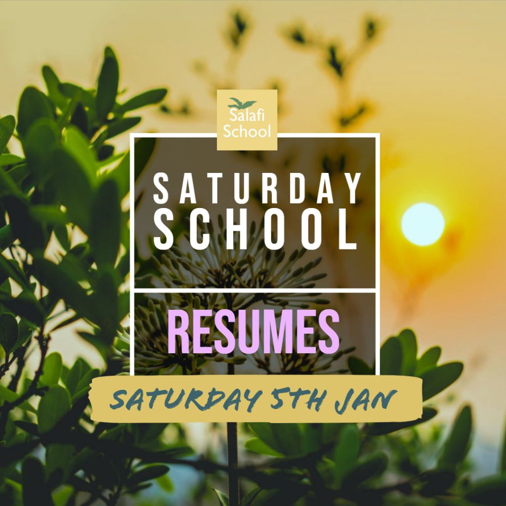 Asalamualaikum wa rahmatullah Notice to all parents that Saturday School resumes on Saturday the 5th of January. We look forward to welcoming all children back, to learn about their Lord, Religion and Prophet together.