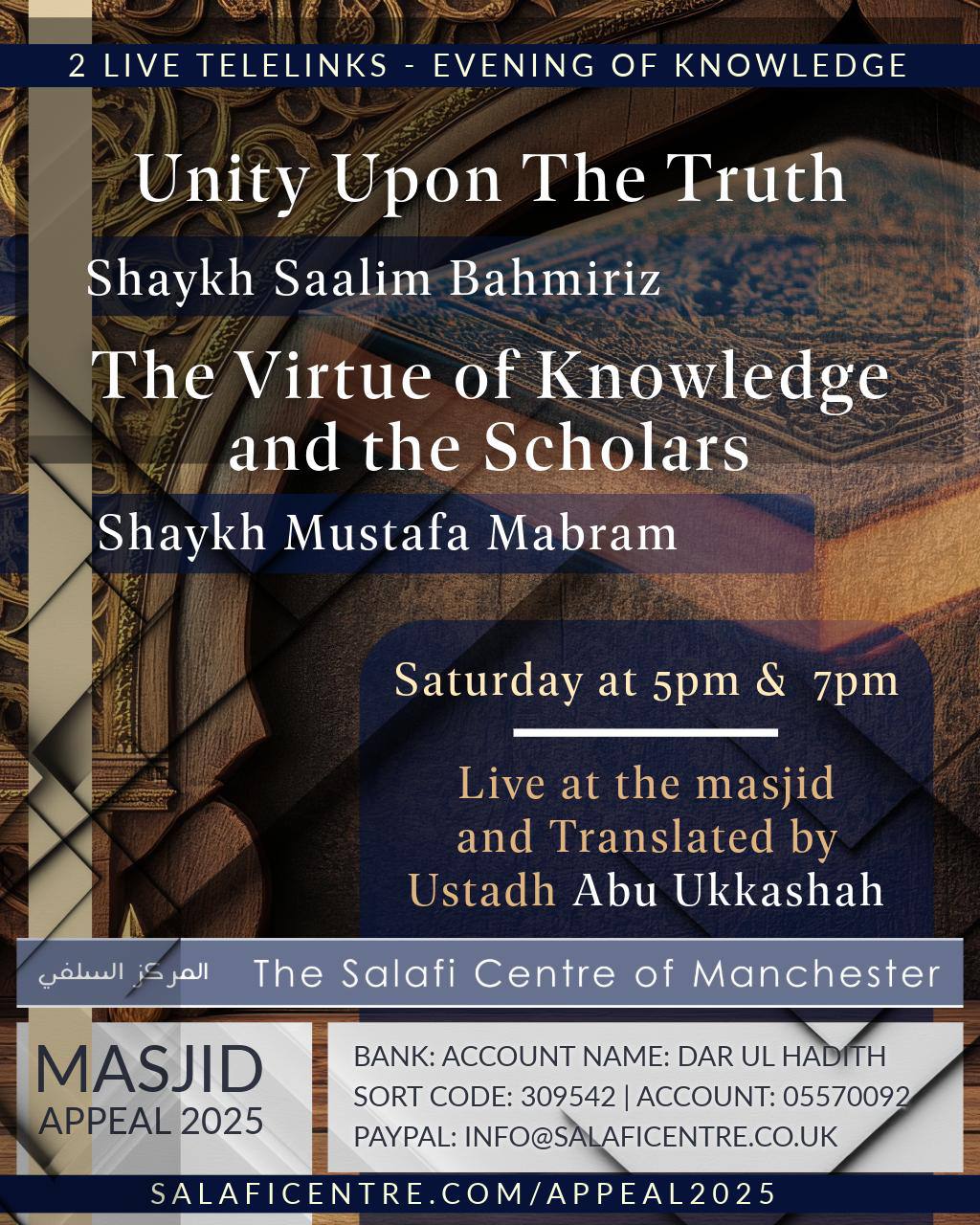 Join us for an Evening of Knowledge with 2 Live Telelinks today at The Salafi Centre of Manchester: