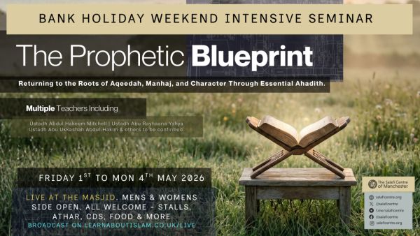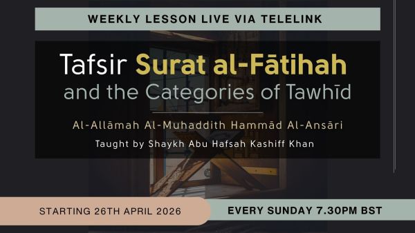 Join us at The Salafi Centre of Manchester every Sunday at 7:30 PM BST for a new weekly lesson. Shaykh Abu Hafsah Kashiff Khan will be teaching the Tafsir of Surat al-Fātihah and the Categories of Tawhīd, based on the works of Al-Allāmah Hammād Al-Ansāri. Starting 26th April 2026. This will be a weekly tele-link and all are welcome to attend.