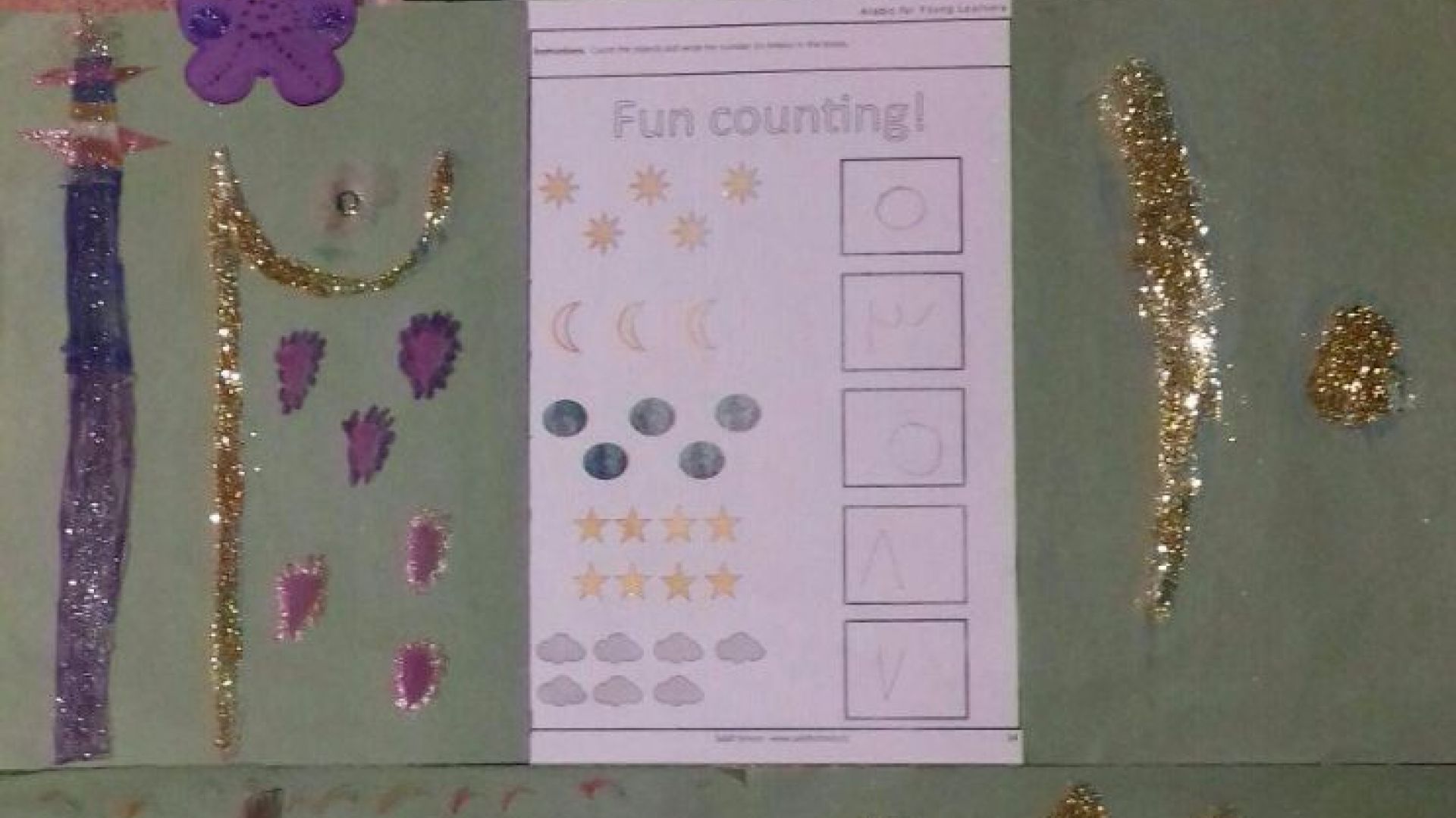 This week Young Learners 5-6 class have been focusing on writing and pronouncing Arabic numbers. The activity involved counting objects as well as saying the number in English and Arabic as the children were asked to write. This followed on by the children creating some beautiful artwork to represent the above.