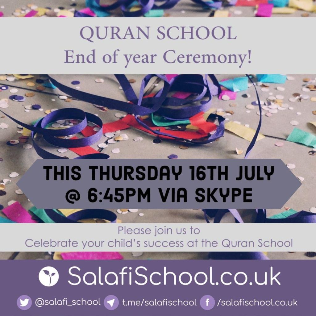 Qur’aan School End of Term and Ceremony on Thursday 16th July 2020!