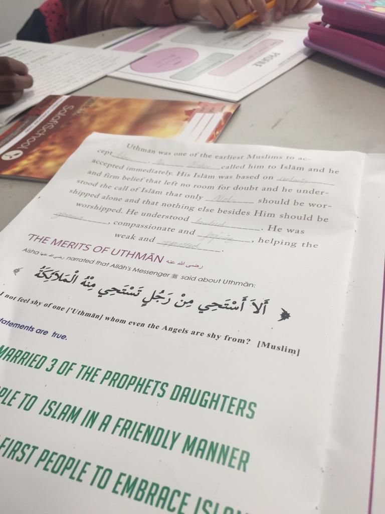Abu Bakr As-Siddeeq called him to Islam and he responded straight away. His Islam was based on certainty and firm belief that left no room for doubt and he understood the call of Islam that only Allah should be worshipped alone and that nothing else besides him should be worshipped. He understood Tawheed. They learnt that he was content, forgiving, compassionate and generous, helping the weak and oppressed. He called others to Islam in a friendly and patient manner. He proposed to the Prophet to marry his daughter Ruqayyah and he married her to him. ‘Uthmaan was from those who underwent trials, torture and persecution at the hands of Quraysh. The Students then went on to fill in the profile worksheets in order to remember facts that they have learnt during class. They look forward to completing the lives of the Sahabaah over the next few weeks.