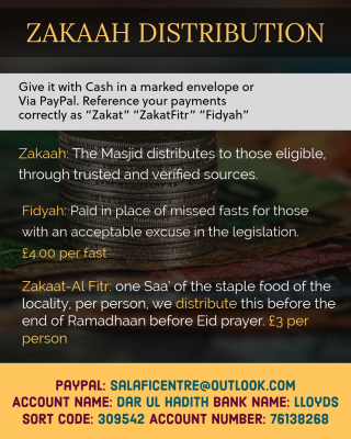 Please place your payment in a clearly marked envelope with the correct reference (“Zakaah”, “Zakaat Al-Fitr”, “Fidyah”) and hand it in at the Masjid Office.